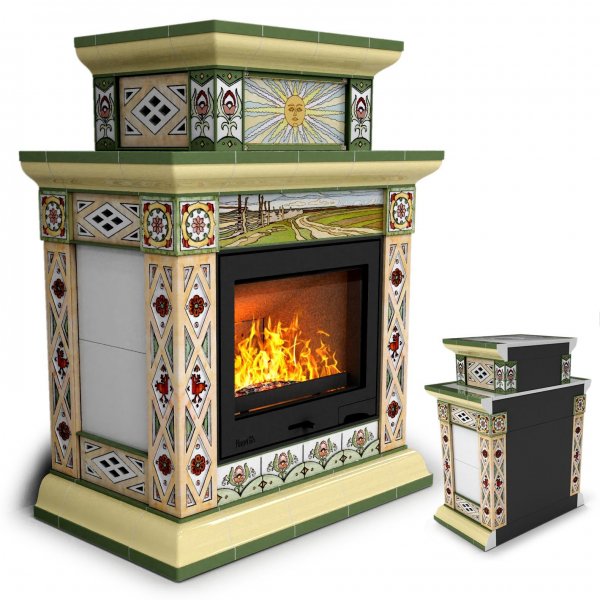 Изразцовый камин Билибин пристенный двухъярусный Осень — камин в стиле «русский модерн» производства КимрПечь (г.Кимры).
