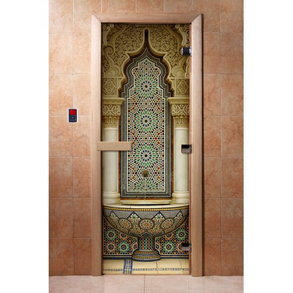 Стеклянная дверь для бани и сауны с фотопечатью А025
