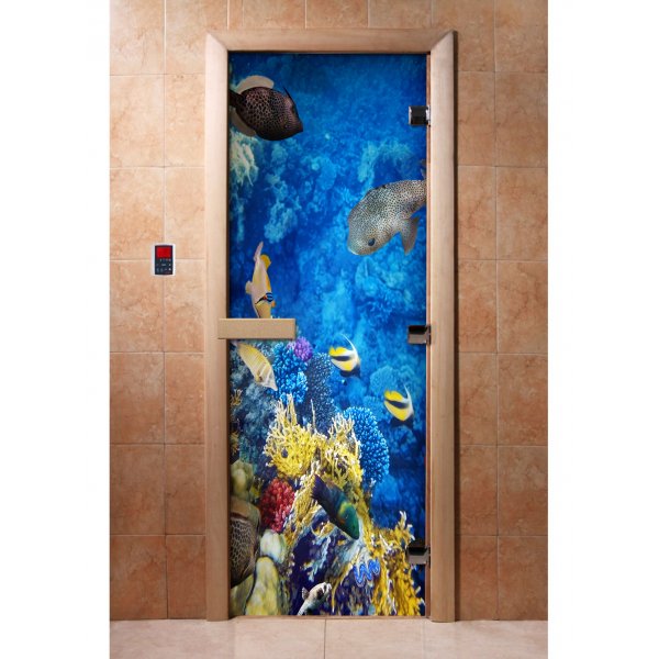 Стеклянная дверь для бани и сауны с фотопечатью А068