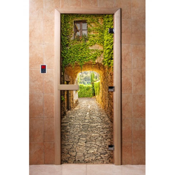 Стеклянная дверь для бани и сауны с фотопечатью А072