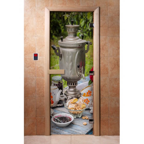 Стеклянная дверь для бани и сауны с фотопечатью А077