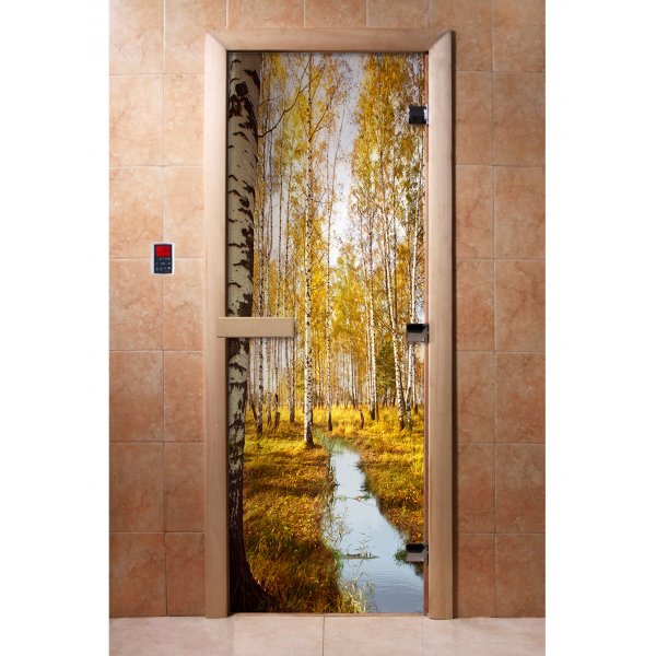 Стеклянная дверь для бани и сауны с фотопечатью А082