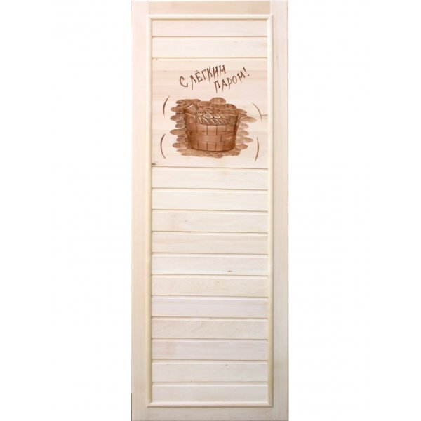 Деревянная дверь «С легким паром!» — это идеальное решение для бань, саун и парных, выполненное из натуральной липы. Эстетичный дизайн с надписью, символизирующей традиционное банное приветствие, создаёт атмосферу уюта и тепла. Дверь прочна, экологична и обладает всеми необходимыми свойствами для эксплуатации в условиях повышенной влажности и температуры. Продаётся без петель и ручек, что позволяет подобрать фурнитуру под индивидуальные требования.
