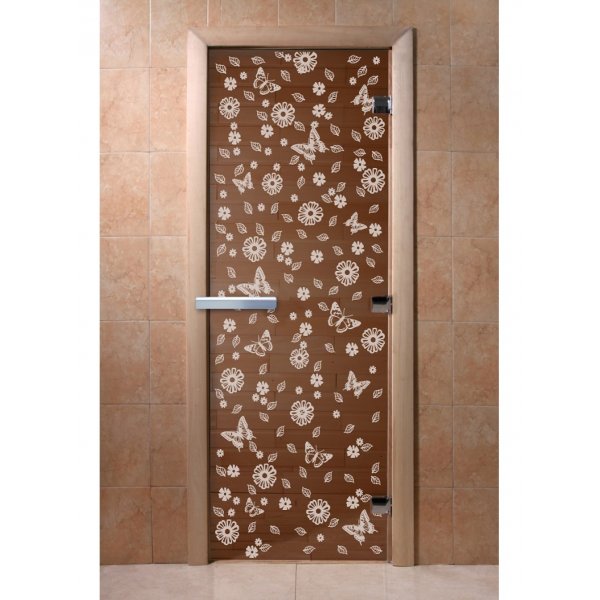 Стеклянная дверь для бани и сауны Цветы и бабочки бронза