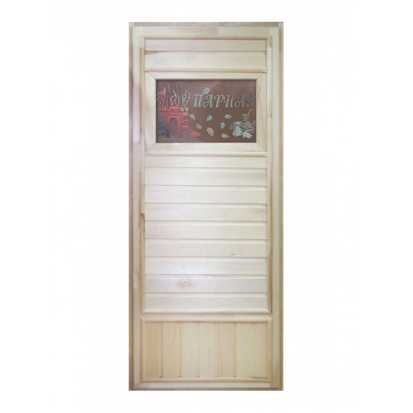 Дверь включает в себя дверную коробку и дверное полотно с стеклянной вставкой с сюжетом.