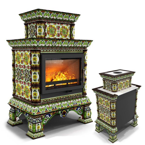 Изразцовая печь на дровах Кострома пристенный двухъярусный Июнь — камин в русском стиле производства КимрПечь (г.Кимры).