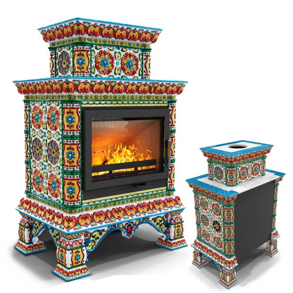 Изразцовая печь на дровах Кострома пристенный двухъярусный Май — камин в русском стиле производства КимрПечь (г.Кимры).