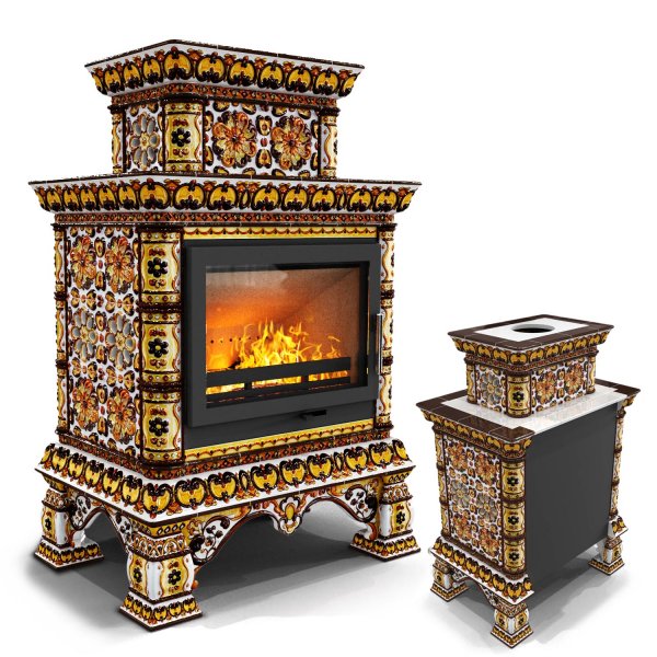 Изразцовая печь на дровах Кострома пристенный двухъярусный Октябрь — камин в русском стиле производства КимрПечь (г.Кимры).