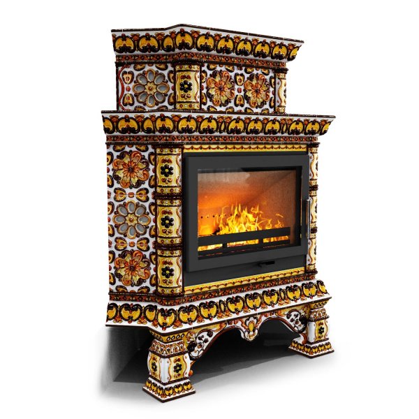 Изразцовая печь на дровах Кострома угловой двухъярусный Октябрь — камин в русском стиле производства КимрПечь (г.Кимры).
