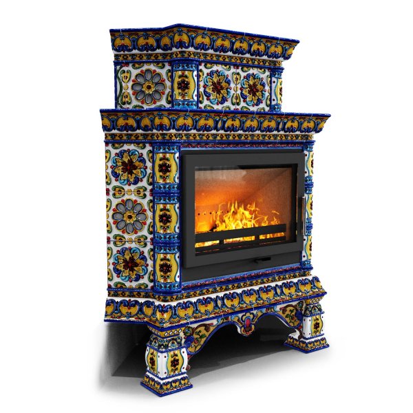 Изразцовая печь на дровах Кострома угловой двухъярусный Январь — камин в русском стиле производства КимрПечь (г.Кимры).