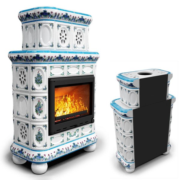 Изразцовый камин Медальон пристенный двухъярусный Незабудки — камин в европейском стиле производства КимрПечь (г.Кимры).