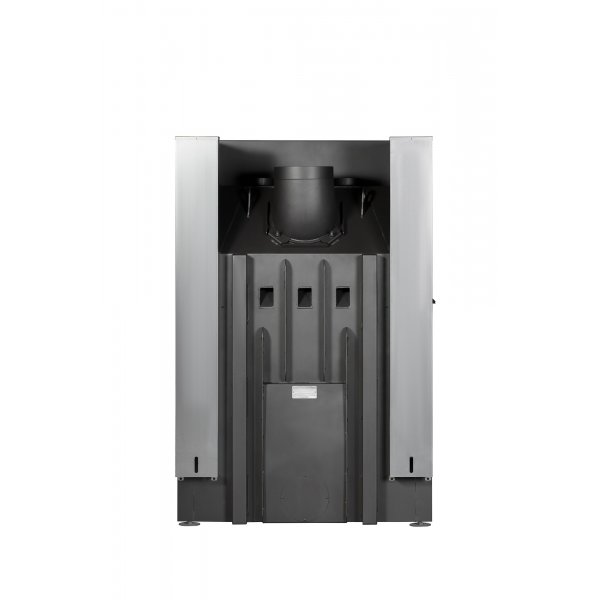 - Система забора воздуха извне, имеет два встроенных патрубка диаметром 125 мм для подключения забора воздуха на горение из соседнего помещения, улицы, подвала, и повышает надежность работы топки.