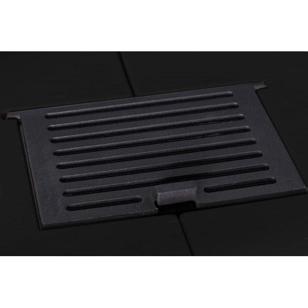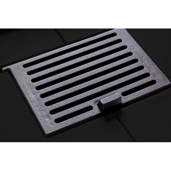 Ребра жесткости по всему корпусу топки и встроенные в дымосборник тепловые каналы позволяют снимать больше тепла и отдавать его в помещение путем конвекции. Высокий дымосборник и пламярассекатель не позволяют дымовым газам попадать в помещение при открывании дверцы. Бесшумная и надежная тросовая система с противовесом и жаропрочными подшипниками, позволяет открывать дверцу топки вверх и производить закладку дров в топочную камеру. Для оптимизации процессов горения все регулировки подачи воздуха на систему первичное горение, систему очистки стекла и встроенную шиберную заслонку производятся специальным ключом «ХОЛОДНАЯ РУКА». Под чугунной колосниковой решеткой в днище топки, находится большой зольный ящик, который удобно вынимается. Устойчивые, регулируемые по высоте ножки, позволяют при монтаже установить топку по уровню.