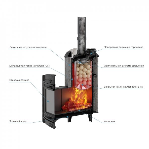 Модель с увеличенной каменкой и повышенной производительностью. Ламели по периметру внешней каменки не только обладают хорошими теплонакопительными свойствами, но и придают печи оригинальный внешний видРежимы - русская баня, сауна, хаммамОбъем парной: