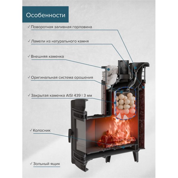Практичная и компактная модель. Ламели по периметру внешней каменки не только обладают хорошими теплонакопительными свойствами, но и придают печи оригинальный внешний видРежимы - русская баня, сауна, хаммамОбъем парной: