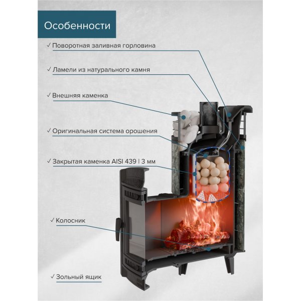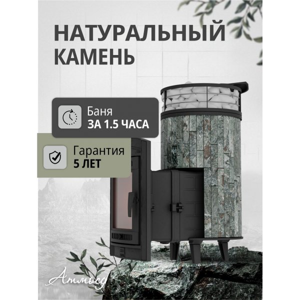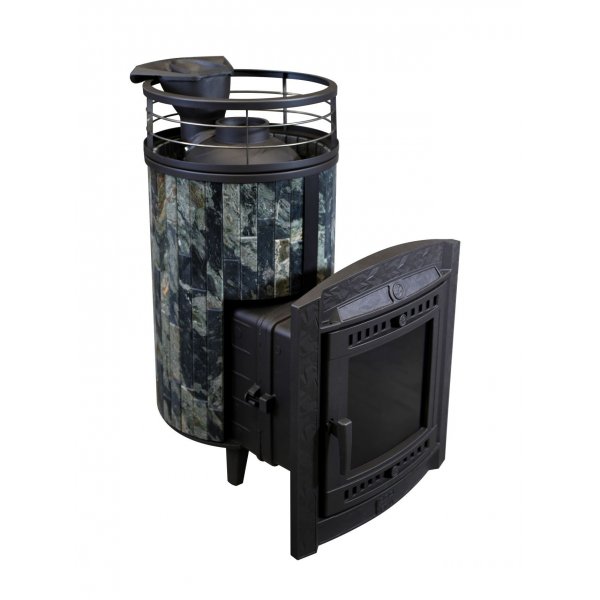 Практичная и компактная модель. Ламели из змеевика по периметру внешней каменки не только обладают хорошими теплонакопительными свойствами, но и придают печи оригинальный внешний видРежимы - русская баня, сауна, хаммамОбъем парной: