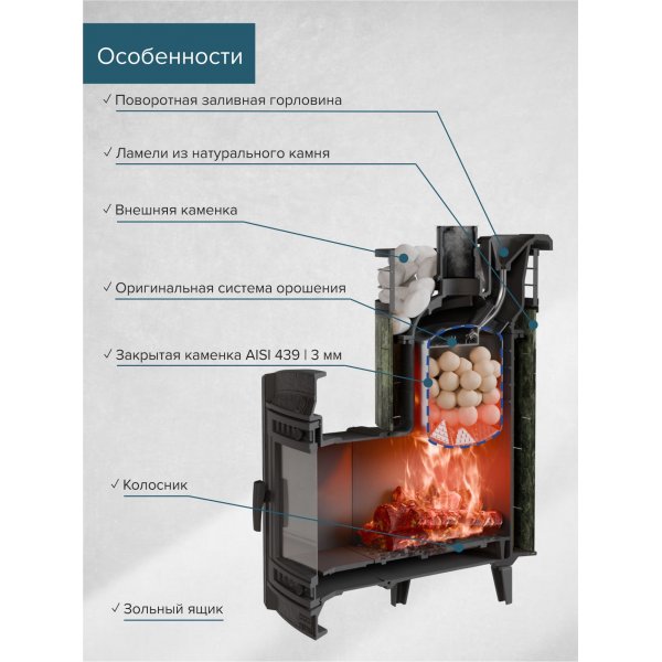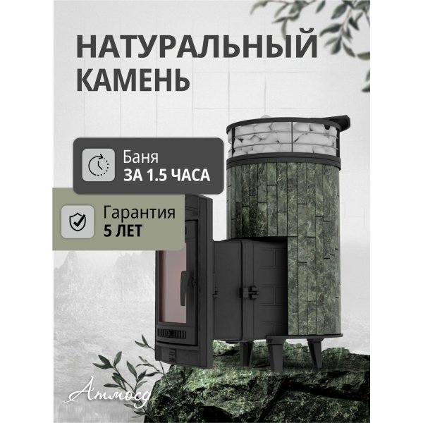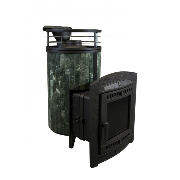 Практичная и компактная модель. Ламели из змеевика по периметру внешней каменки не только обладают хорошими теплонакопительными свойствами, но и придают печи оригинальный внешний видРежимы - русская баня, сауна, хаммамОбъем парной: