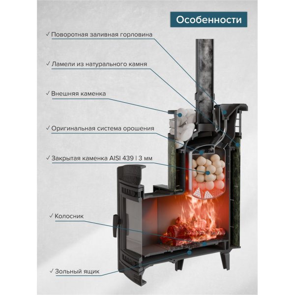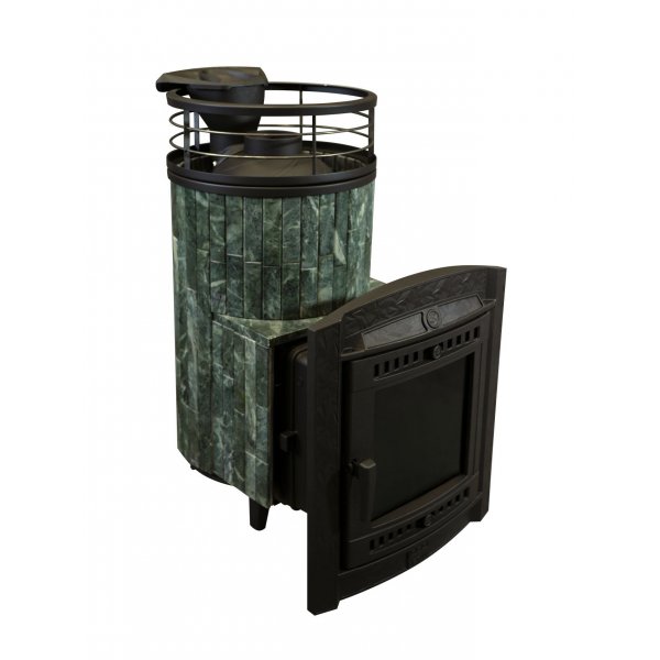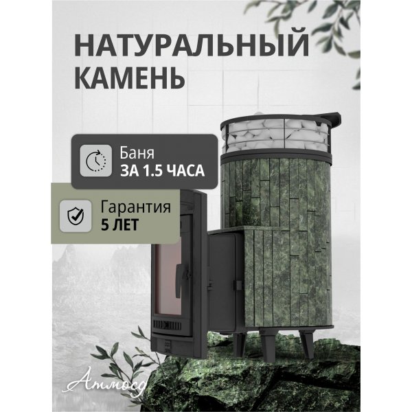 Практичная и компактная модель. Ламели из змеевика по периметру внешней каменки не только обладают хорошими теплонакопительными свойствами, но и придают печи оригинальный внешний видРежимы - русская баня, сауна, хаммамОбъем парной: