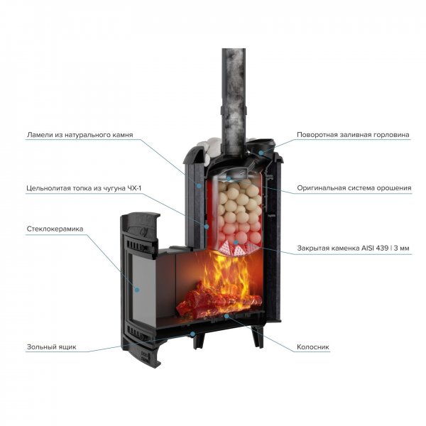 Модель с увеличенной каменкой и повышенной производительностью. Ламели из пироксенита по периметру внешней каменки не только обладают хорошими теплонакопительными свойствами, но и придают печи оригинальный внешний видРежимы - русская баня, сауна, хаммамОбъем парной: