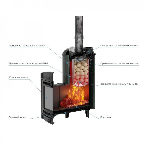 Модель с увеличенной каменкой и повышенной производительностью. Ламели по периметру внешней каменки не только обладают хорошими теплонакопительными свойствами, но и придают печи оригинальный внешний видРежимы - русская баня, сауна, хаммамОбъем парной: