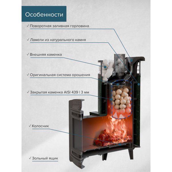 Модель с увеличенной каменкой и повышенной производительностью. Ламели по периметру внешней каменки не только обладают хорошими теплонакопительными свойствами, но и придают печи оригинальный внешний видРежимы - русская баня, сауна, хаммамОбъем парной: