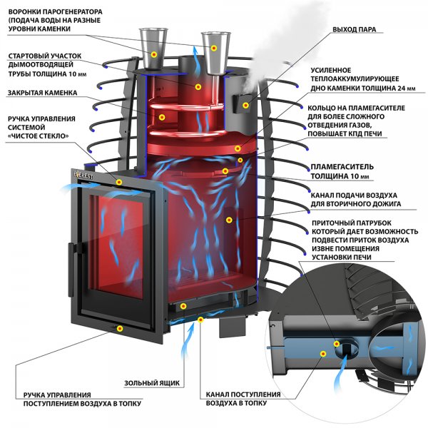 Стартовый участок дымоотводящей трубы толщиной 10 мм и диаметром 115 мм предназначен для максимального теплосъёма, он увеличивает площадь нагрева заклада внутри каменки, что быстрее выводит печь в рабочий режим. Дно закрытой каменки толщиной 24 мм не только разделяет пространство топочной камеры и самой каменки, но и является мощнейшим теплоаккумулятором который накапливает в себе энергию и отдает ее в заклад каменки. На пламегасителе толщиной 10 мм предусмотрено кольцо, оно предназначено для более сложного отвода дымовых газов, в следствии чего увеличивается кпд изделия. ВАЖНО! Устанавливается пламегаситель кольцом вверх!