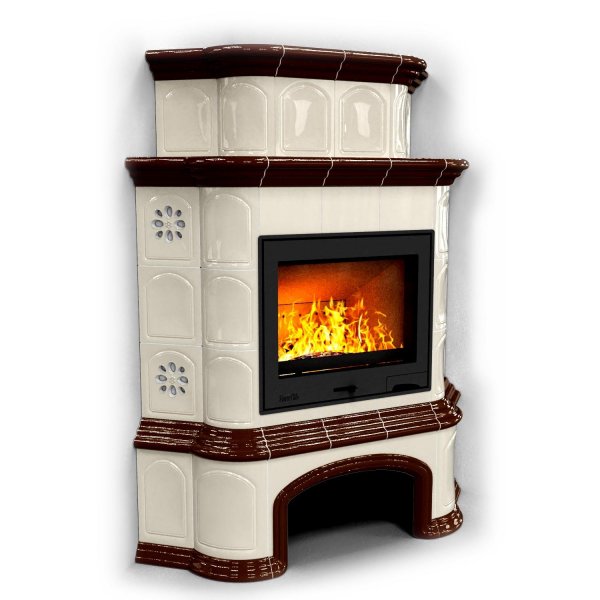Изразцовый камин Прованс с дровником угловой двухъярусный Шоколад проверенный временем конвекционный камин производства КимрПечь (г.Кимры).