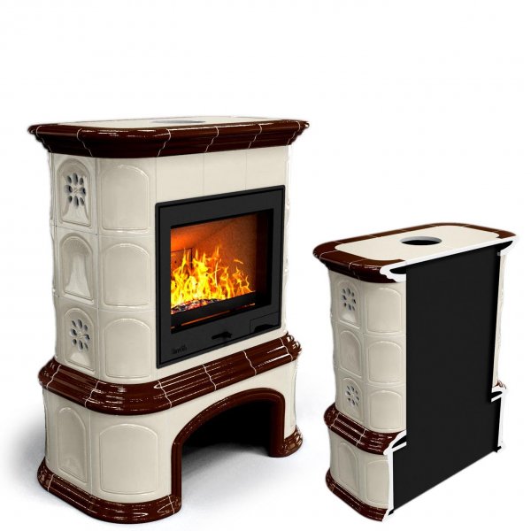 Печь камин длительного горения с изразцами Прованс с дровником пристенный Шоколад.