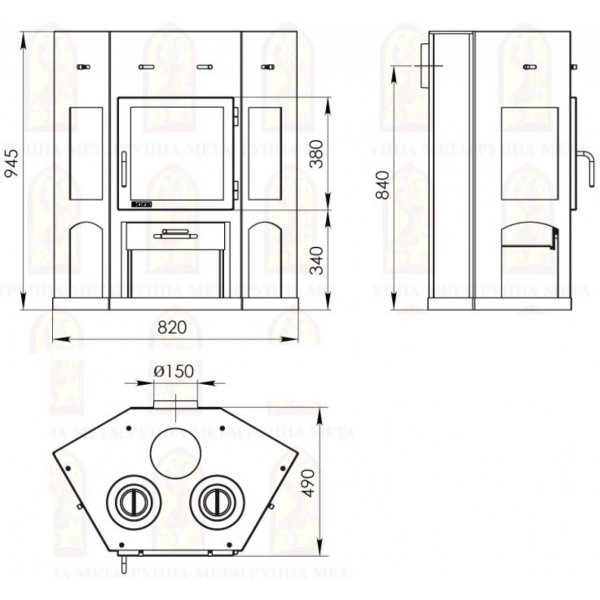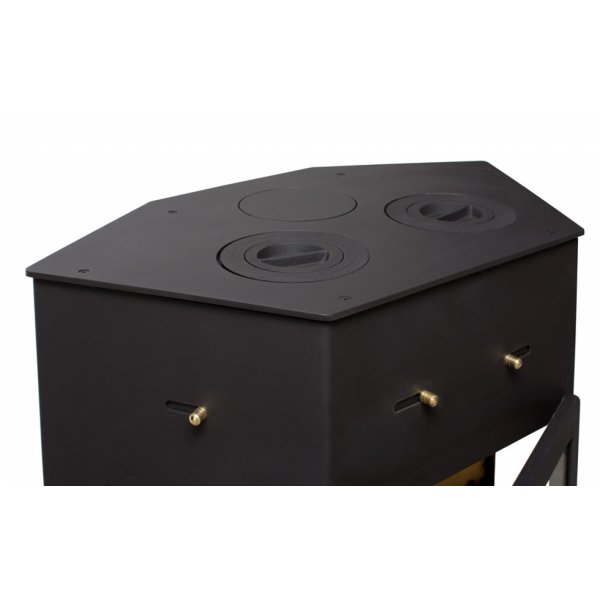- Верхняя панель печи изготовлена из стали толщиной 8 мм и представляет из себя удобную варочную поверхность с двумя конфорками, диаметр которых можно регулировать.