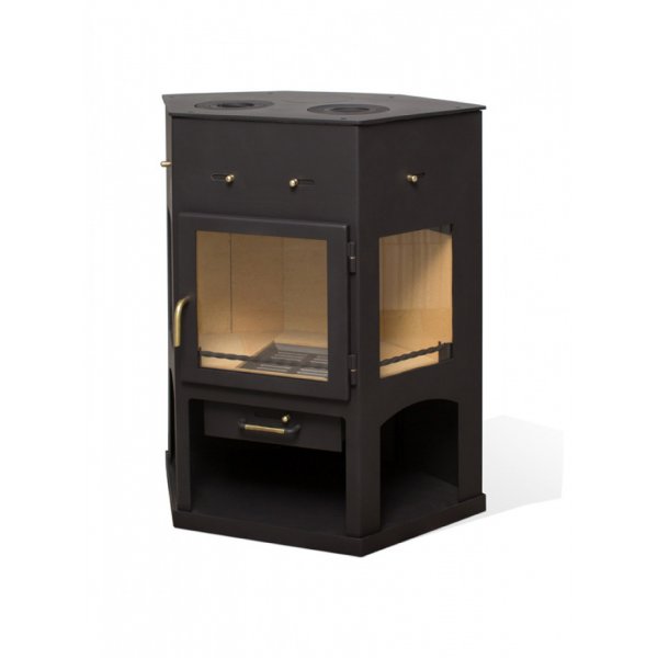 - Печь рассчитана на пристенно-угловую установку, несмотря на внушительные размеры она не займет много места. Более того, панорамное остекление (дверца плюс боковые стенки) визуально облегчают конструкцию.