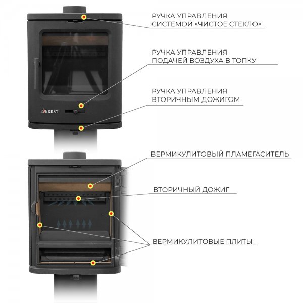 Компактная, стильная и мощная новинка от компании Everest. Печь-камин изготовлена из качественного жаростойкого чугуна ГОСТ 141285 с толщиной стенок 6-8 мм. Модель мощностью 7 кВт, рассчитана на обогрев помещений объёмом до 140 м³. Печь-камин имеет вермикулитовый пламегаситель. На чугунной дверке предусмотрена ручка с регулировкой силы прижатия. Топка усилена вермикулитовыми плитами с системой двухуровневого вторичного дожига. С помощью этой функции по специальному каналу поступает воздух, который нагревается при прохождении между топочной камерой и задней стенкой корпуса. Далее нагретый воздух через дефлектор поступает в топку, перемешивается с газами - продуктами горения, чем вызывает повторное возгорание. Регулировка этой системы, осуществляется заслонкой, расположенной в нижней части печи-камина. Регулировка подачи воздуха в колосниковую зону осуществляется заслонкой, расположенной на двери. В верхней части расположена ручка регулировки системы чистое стекло, которая помогает оставаться стеклу чистым отсекая сажу и копоть воздухом, подаваемым с верхней части топки. Патрубок дымохода Ø 120 мм – универсальный, со сменным положением. Он может быть установлен сверху или сзади в зависимости от размещения печи в помещении.