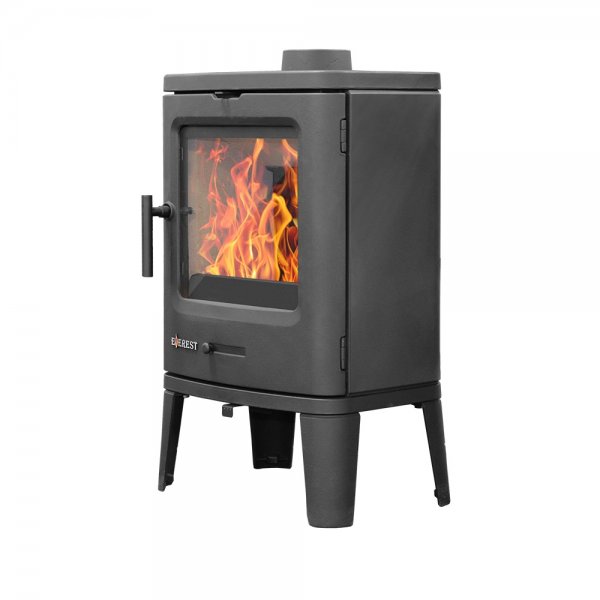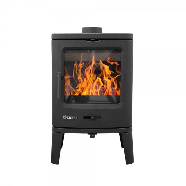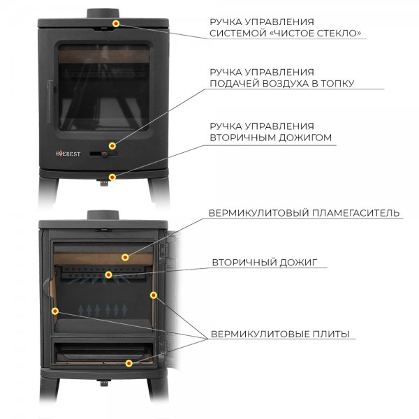 Компактная, стильная и мощная новинка от компании Everest. Печь-камин изготовлена из качественного жаростойкого чугуна ГОСТ 141285 с толщиной стенок 6-8 мм. Модель мощностью 7 кВт, рассчитана на обогрев помещений объёмом до 140 м³. Печь-камин имеет вермикулитовый пламегаситель. На чугунной дверке предусмотрена ручка с регулировкой силы прижатия. Топка усилена вермикулитовыми плитами с системой двухуровневого вторичного дожига. С помощью этой функции по специальному каналу поступает воздух, который нагревается при прохождении между топочной камерой и задней стенкой корпуса. Далее нагретый воздух через дефлектор поступает в топку, перемешивается с газами - продуктами горения, чем вызывает повторное возгорание. Регулировка этой системы, осуществляется заслонкой, расположенной в нижней части печи-камина. Регулировка подачи воздуха в колосниковую зону осуществляется заслонкой, расположенной на двери. В верхней части расположена ручка регулировки системы чистое стекло, которая помогает оставаться стеклу чистым отсекая сажу и копоть воздухом, подаваемым с верхней части топки. Патрубок дымохода Ø 120 мм – универсальный, со сменным положением. Он может быть установлен сверху или сзади в зависимости от размещения печи в помещении.