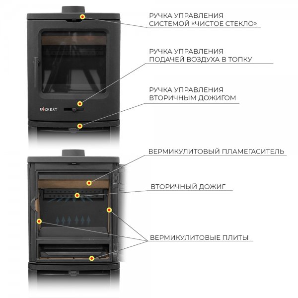 Компактная, стильная и мощная новинка от компании Everest. Печь-камин изготовлена из качественного жаростойкого чугуна ГОСТ 141285 с толщиной стенок 6-8 мм. Модель мощностью 7 кВт, рассчитана на обогрев помещений объёмом до 140 м³. Печь-камин имеет вермикулитовый пламегаситель. На чугунной дверке предусмотрена ручка с регулировкой силы прижатия. Топка усилена вермикулитовыми плитами с системой двухуровневого вторичного дожига. С помощью этой функции по специальному каналу поступает воздух, который нагревается при прохождении между топочной камерой и задней стенкой корпуса. Далее нагретый воздух через дефлектор поступает в топку, перемешивается с газами - продуктами горения, чем вызывает повторное возгорание. Регулировка этой системы, осуществляется заслонкой, расположенной в нижней части печи-камина. Регулировка подачи воздуха в колосниковую зону осуществляется заслонкой, расположенной на двери. В верхней части расположена ручка регулировки системы чистое стекло, которая помогает оставаться стеклу чистым отсекая сажу и копоть воздухом, подаваемым с верхней части топки. Патрубок дымохода Ø 120 мм – универсальный, со сменным положением. Он может быть установлен сверху или сзади в зависимости от размещения печи в помещении.