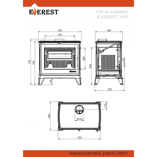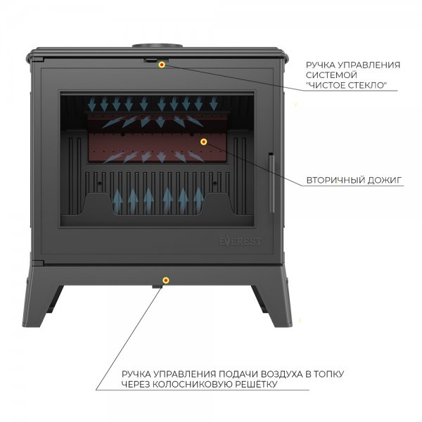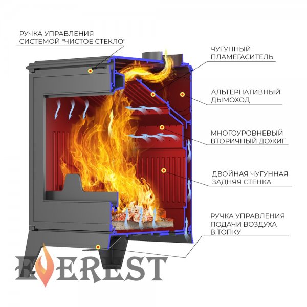 Печь-камин EVEREST Н16 изготовлена из качественного жаростойкого чугуна с толщиной стенок 6-8 мм. Модель рассчитана на обогрев помещений объёмом до 320м³. Печь-камин имеет пламегаситель изготовлен из жаростойкого чугуна (ГОСТ 1412-85). Топка печи-камина усилена чугунными вставками с системой трёхуровневый вторичного дожига. С помощью этой функции по каналам подачи вторичного воздуха поступает воздух, который нагревается при прохождении между топочной камерой и стенками корпуса. Далее нагретый воздух через дефлектор поступает в топку, перемешивается с газами - продуктами горения, чем вызывает повторное возгорание. Регулировка этой системы, как и подача воздуха в колосниковую зону, осуществляется рычагом, расположенным в нижней части печи-камина. В верхней части над топочной дверью расположена ручка регулировки системы чистое стекло, которая препятствует оседанию сажи на внутреннюю поверхность стекла. Патрубок дымохода Ø 150мм – универсальный, со сменным положением. Он может быть установлен сверху или сзади в зависимости от размещения печи в помещении.