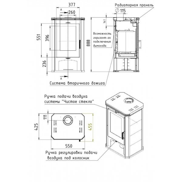 - Топочная камера вмещает поленья длиной до 27 см. Сгорают они полностью и максимально эффективно - за это отвечает встроенная система вторичного дожига газов.