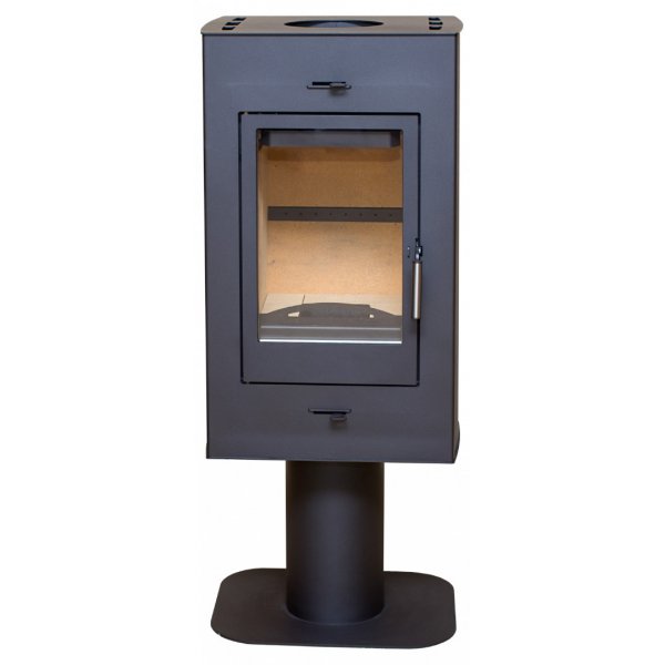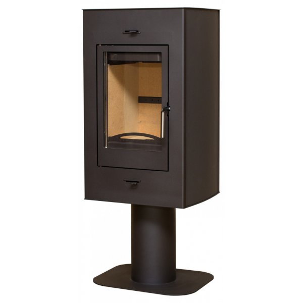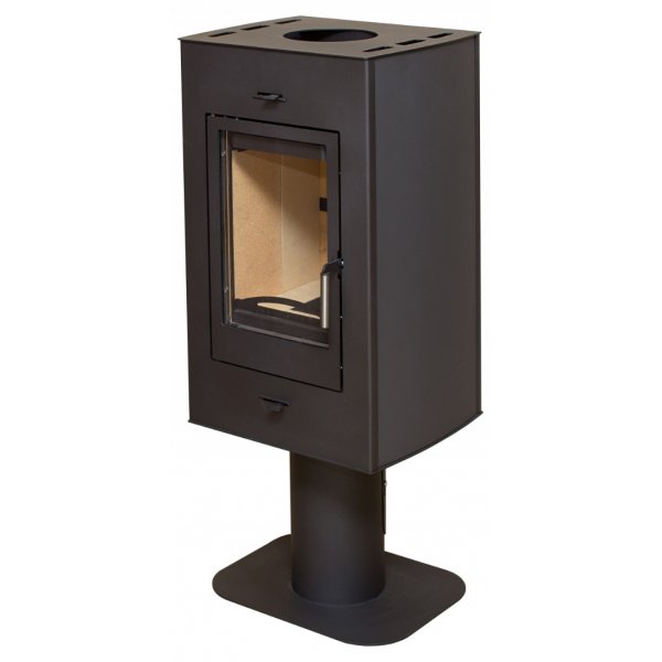 Стальная печь-камин квадратного сечения на подставке-ноге Рона изготовлена в сдержанном европейском стиле, поэтому она отлично впишется как в классический, так и в более современный интерьер. Печь максимально проста в оформлении: геометричная форма корпуса, покрытого матовой черной термостойкой эмалью не отвлекает внимание от главного - игры живого огня, за которой удобно наблюдать сквозь остекленную дверцу топочной камеры.