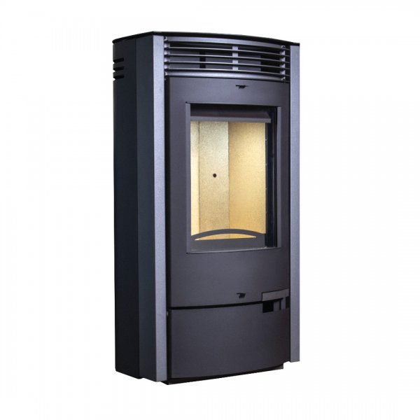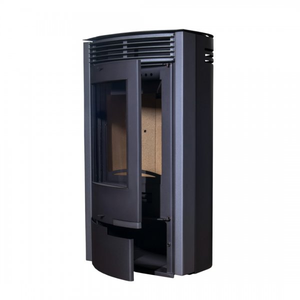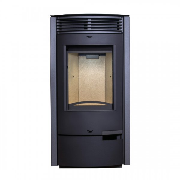 - Большую часть передней панели занимает дверца со стеклом. Несмотря на внушительные размеры, закрывается она абсолютно герметично, а открывается легким движением руки. За чистоту стекла отвечает система обдува теплым воздухом, а за его целостность - специальная защитная решетка в передней части топочной камеры.