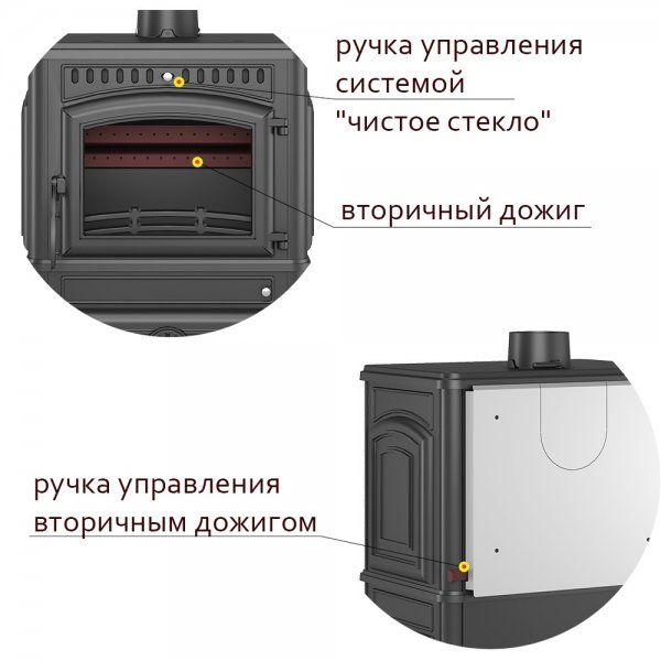 Топка печи-камина усилена чугунными вставками с системой вторичного дожига. С помощью этой функции по каналам подачи вторичного воздуха поступает кислород, который нагревается при прохождении между топочной камерой и стенками корпуса. Далее нагретый воздух через дефлектор поступает в топку, перемешивается с газами - продуктами горения, чем вызывает повторное возгорание. Регулировка этой системы осуществляется рычагом, расположенным справа на тыльной стороне печи-камина. Над дверцей печи-камина расположена система чистое стекло, которая помогает оставаться стеклу чистым. В нижней части печи на дверце зольного ящика расположена ручка для регулировки подачи воздуха в колосниковую зону, которая помогает контролировать интенсивность горения. В нижней части топки предусмотрена колосниковая решётка, которую можно привести в движение с помощью ручки, которая выведена справа на корпус печи. За счет этой функции появилась возможность безопасно сбрасывать золу в зольный ящик. Патрубок дымохода Ø 120мм со встроенной шиберной заслонкой – универсальный, со сменным положением. Он может быть установлен сверху или сзади в зависимости от размещения печи в помещении.