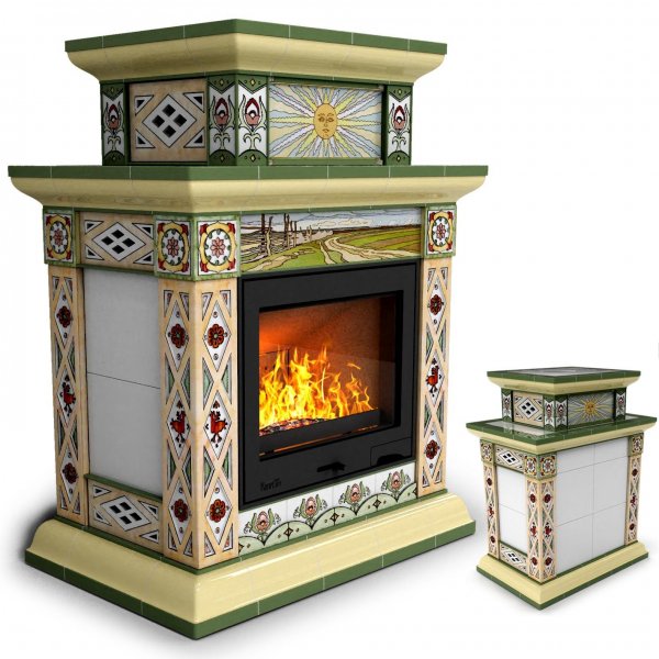 Керамическая дровяная печь Билибин центральный двухъярусный Осень — камин в стиле «русский модерн» производства КимрПечь (г.Кимры).