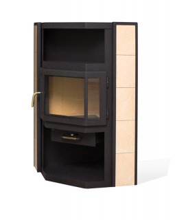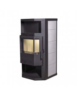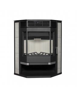 Стальная печь-камин Ангара с призматическим остеклением дверцы топки и облицовкой из керамической пл..