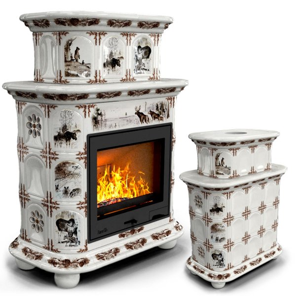 Изразцовый камин Прованс центральный двухъярусный Зима в лесу проверенный временем конвекционный камин производства КимрПечь (г.Кимры).