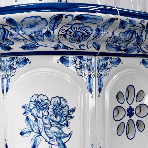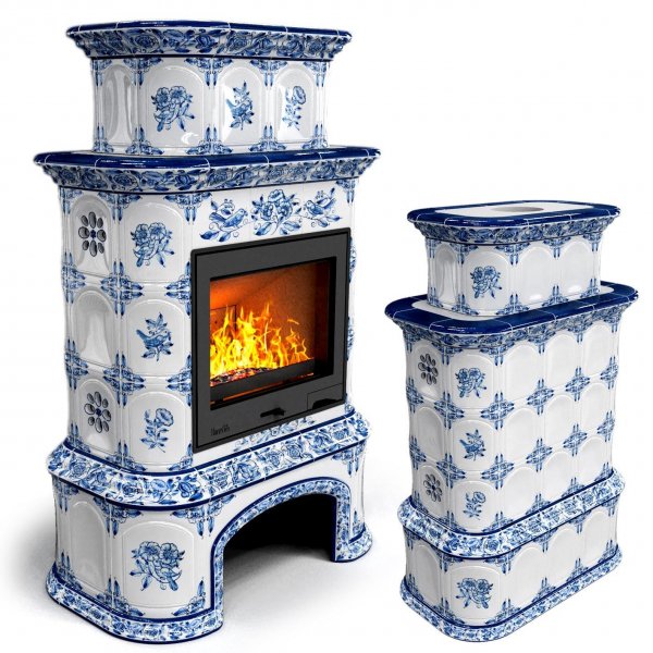 Изразцовый камин Прованс с дровником центральный двухъярусный Дельфт проверенный временем конвекционный камин производства КимрПечь (г.Кимры).