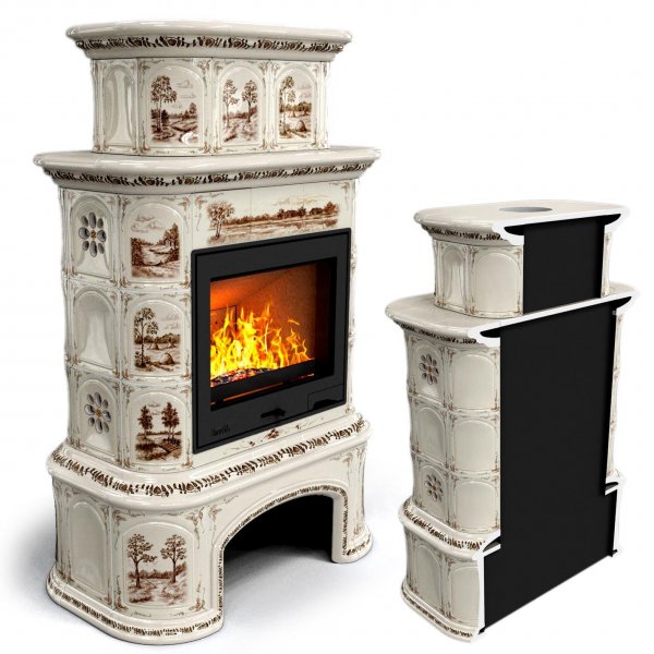 Изразцовый камин Прованс с дровником пристенный двухъярусный Деревня- проверенный временем конвекционный камин производства КимрПечь (г.Кимры).