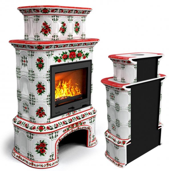 Изразцовый камин Прованс с дровником пристенный двухъярусный Маки проверенный временем конвекционный камин производства КимрПечь (г.Кимры).