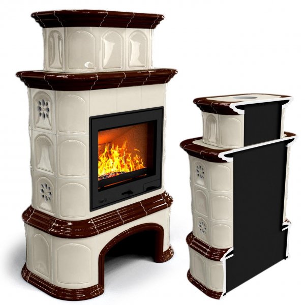 Изразцовый камин Прованс с дровником пристенный двухъярусный Шоколад- проверенный временем конвекционный камин производства КимрПечь (г.Кимры).