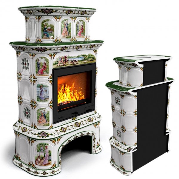 Изразцовый камин Прованс с дровником пристенный двухъярусный Усадьба проверенный временем конвекционный камин производства КимрПечь (г.Кимры).