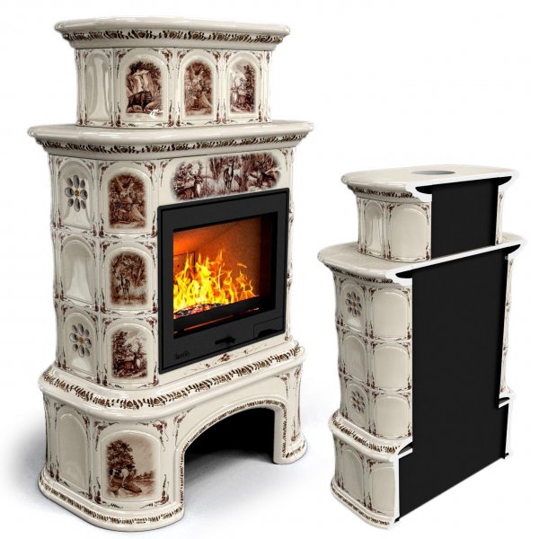 Изразцовый камин Прованс с дровником пристенный двухъярусный Звери проверенный временем конвекционный камин производства КимрПечь (г.Кимры).