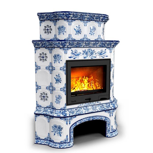 Изразцовый камин Прованс с дровником угловой двухъярусный Дельфт проверенный временем конвекционный камин производства КимрПечь (г.Кимры).