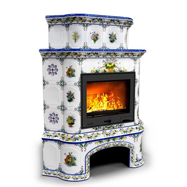 Изразцовый камин Прованс с дровником угловой двухъярусный Луг проверенный временем конвекционный камин производства КимрПечь (г.Кимры).