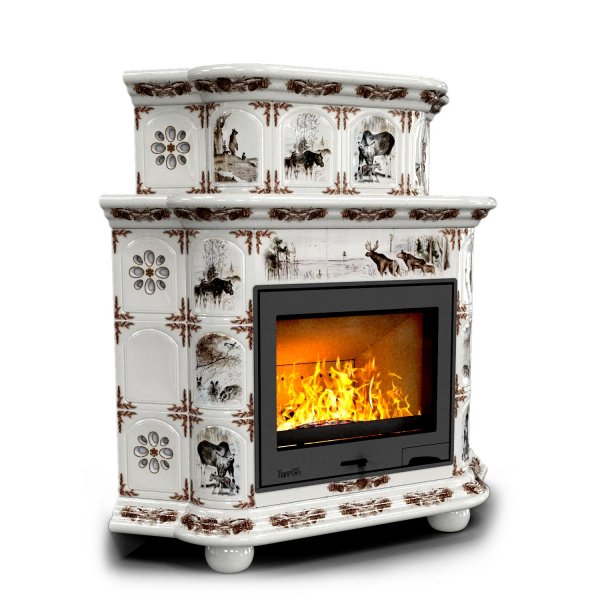 Изразцовый камин Прованс угловой двухъярусный Зима в лесу проверенный временем конвекционный камин производства КимрПечь (г.Кимры).